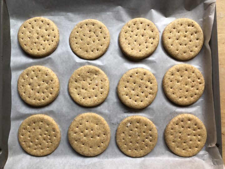 Disporre, man mano, le focaccine semi integrali sulla placca rivestita con carta da forno e bucherellarle con uno spiedino di legno. Questo passaggio è puramente decorativo e può essere saltato.