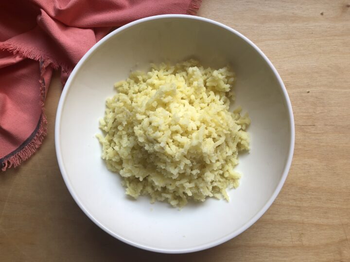 Passarle allo schiacciapatate quando sono ancora calde e raccogliere la purea in una ciotola capiente (non è necessario sbucciarle, la buccia resterà all’interno dell’attrezzo).