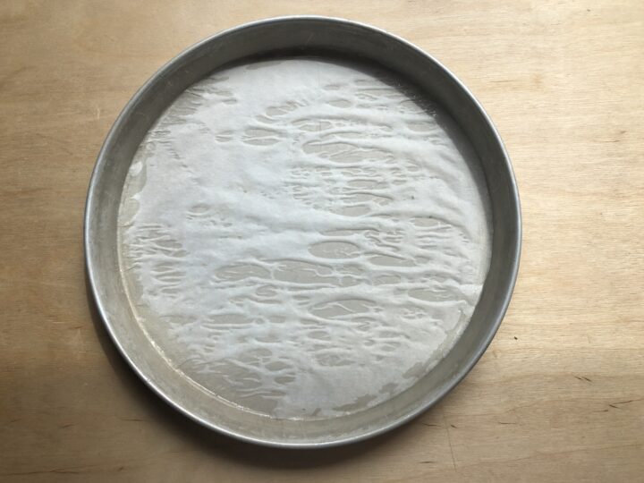 Rivestire con carta da forno il fondo di una teglia del diametro di 28 cm e spennellare i bordi con dell’olio.