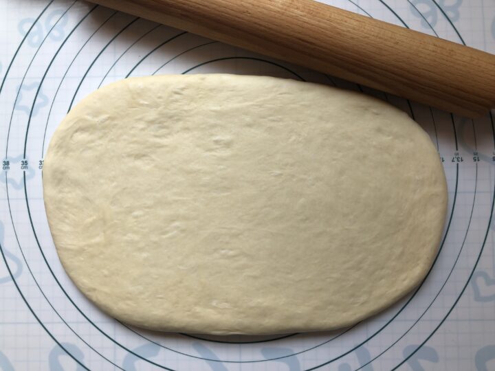 Trascorso il tempo della prima lievitazione, trasferire l’impasto sulla spianatoia e appiattirlo prima con le mani e poi con il mattarello formando un rettangolo.