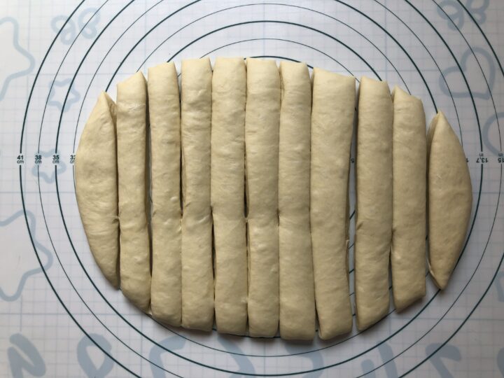 Prendere in mano ogni striscia e tirarla leggermente, poi tagliarla a metà.