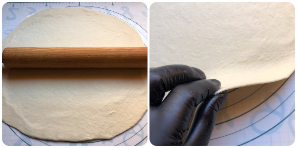Trascorso il tempo di questa prima lievitazione, trasferire l’impasto sulla spianatoia leggermente infarinata e stenderlo con il mattarello ad uno spessore di circa 2 mm.