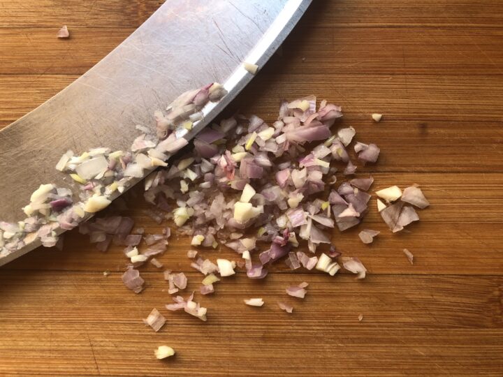 Spellare lo spicchio di aglio e lo scalogno e tritarli finemente.