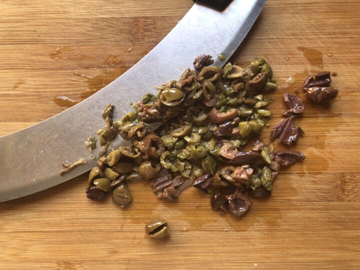 Tritare grossolanamente anche i capperi e le olive taggiasche. Potete utilizzare sia capperi sotto sale che sott’aceto. In entrambi i casi vi consiglio di sciacquarli bene sotto acqua corrente e di tamponarli con carta da cucina.