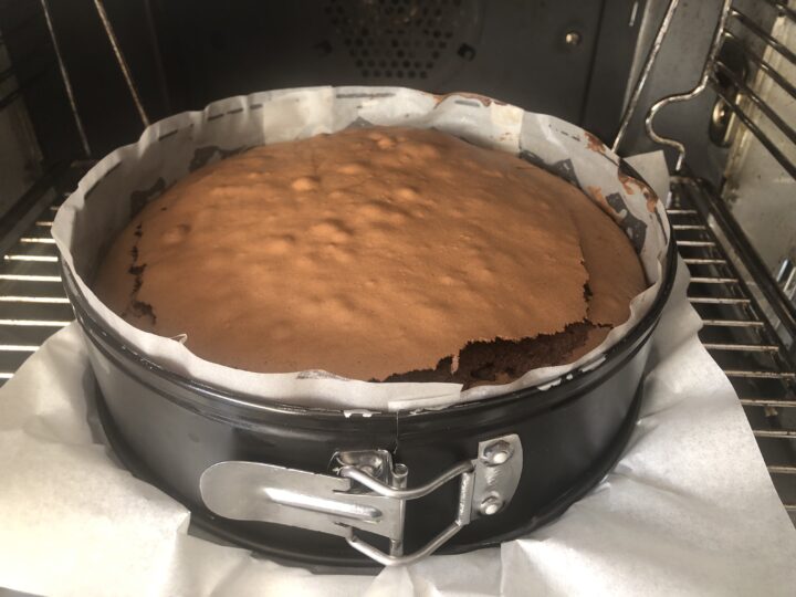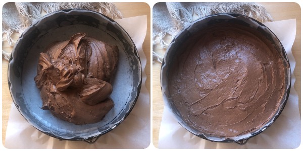 Versare l’impasto all’interno di una tortiera del diametro di 24 cm precedentemente rivestita con carta da forno e livellarlo. Vi consiglio di utilizzarne una a cerniera perché sarà molto più semplice sformare la torta.