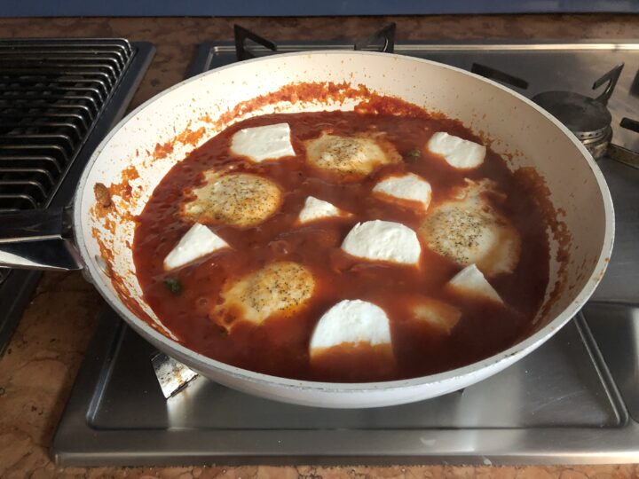 Ora sgusciare le uova all’interno del sugo di pomodoro, poi salarle e peparle a piacere. Mettere il coperchio e proseguire la cottura per 6/7 minuti sempre a fiamma dolce.