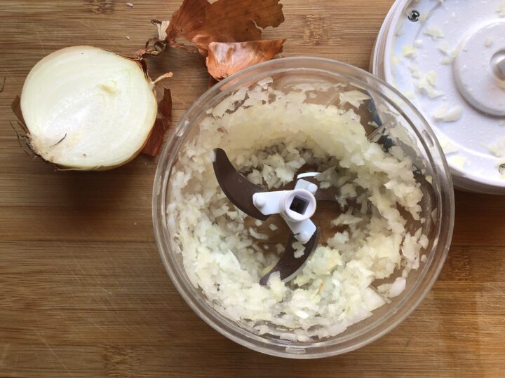 Spellare la cipolla e tritarla finemente. Niente più lacrime se usate un tritatutto manuale a corda che è davvero comodissimo.Se desiderate acquistarlo lo potete trovare cliccando QUI.