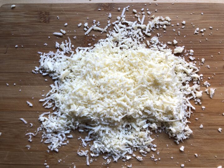 Grattugiare il Castelmagno con una grattugia a fori grossi.