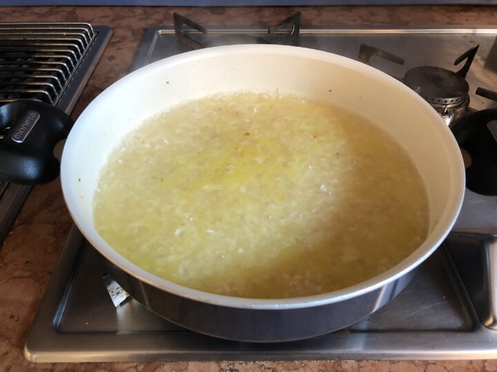 Quando risulta morbida e trasparente, unire il riso e tostarlo per un paio di minuti, mescolando spesso.