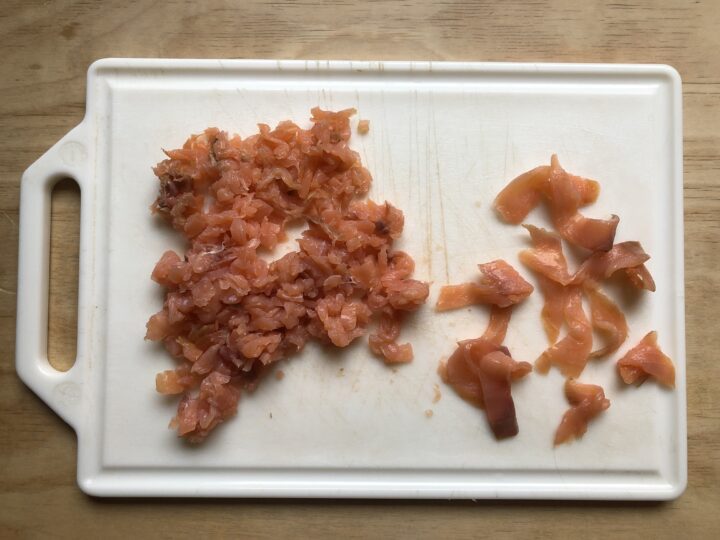 Sminuzzare grossolanamente 150 g di salmone affumicato e tagliare a listarelle i restanti 50 g. Mettere da parte.