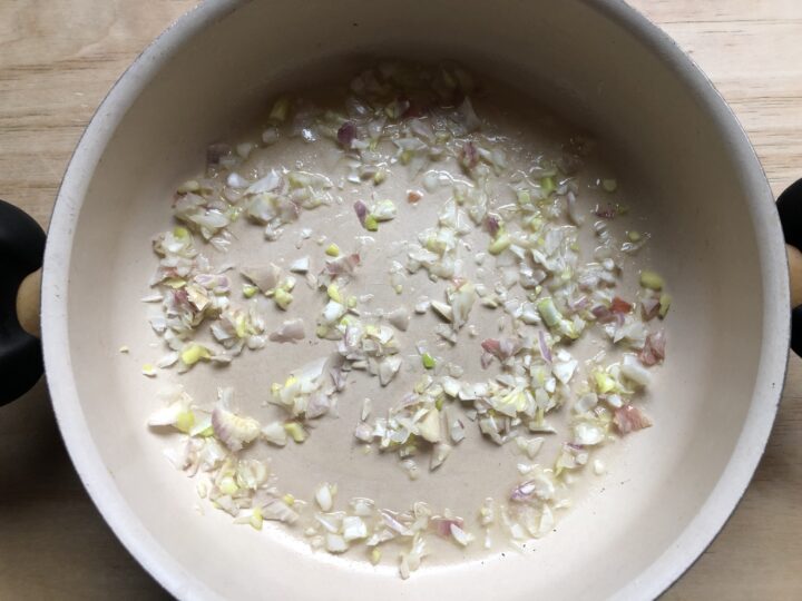 Spellare lo scalogno, tritarlo finemente e soffriggerlo all’interno di un capiente tegame in cui si saranno sciolti 20 g di burro.