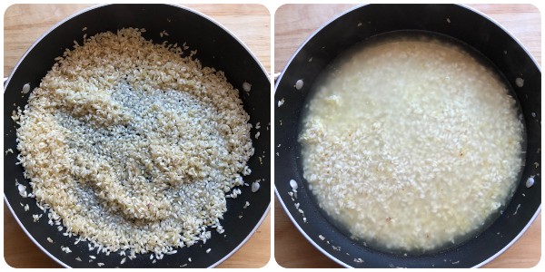 Lasciarlo sfrigolare per qualche istante, poi unire il riso e tostarlo per un paio di minuti.