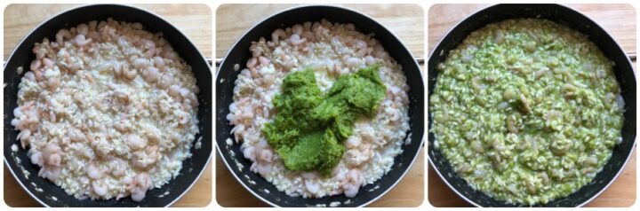 Dopo una decina di minuti circa aggiungere anche i gamberetti e la purea di asparagi e mescolare con cura. Io ho usato dei gamberetti sgusciati e surgelati e li ho tolti dal freezer la sera prima e lasciati scongelare in frigorifero. Se utilizzate, invece, dei gamberi freschi è necessario eliminare testa, coda e zampe, togliere il carapace (cioè il guscio) ed il filetto intestinale nero e sciacquarli sotto acqua corrente.