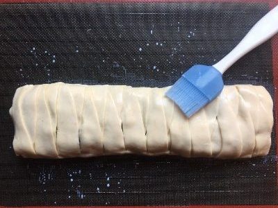 Trasferire il rustico in una teglia (o sulla placca) sempre mantenendolo appoggiato sul foglio di carta da forno e spennellarlo con un po’ di latte. Io l’ho messo sopra ad un tappetino in silicone microforato che, poi, ho appoggiato sulla griglia del forno. Questo consente una cottura ottimale anche della base.