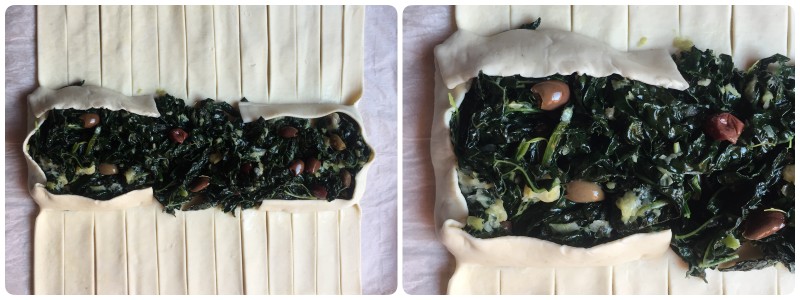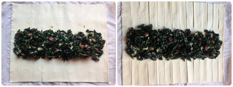 Poi coprire tutto il ripieno, intrecciando su di esso le listarelle di pasta sfoglia. Anche in questo caso le foto vi aiuteranno meglio delle parole. Non preoccupatevi se vi rimarrà qualche spiraglio: questo è un ripieno che non si scioglie e non cola; resterà perfetto lo stesso.