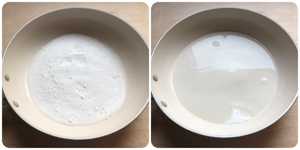 Ora, in una padella versare lo zucchero, unire 150 ml di acqua e portare sul fuoco.