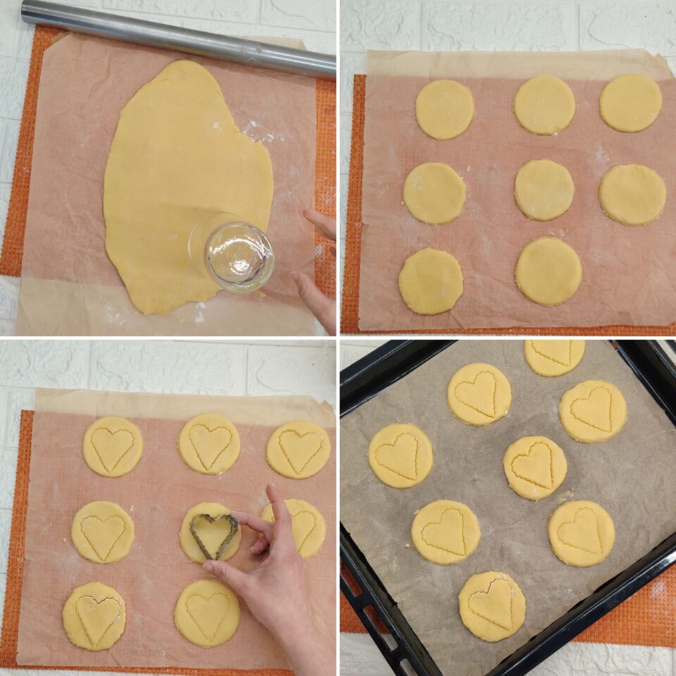 Trascorso il tempo del riposo, riprendete l’impasto e stendetelo con il mattarello su un piano leggermente infarinato o direttamente su un foglio di carta forno. Per dare forma ai miei biscottoni, ho utilizzato un semplice bicchiere per ritagliare dei cerchi e, con uno stampino più piccolo, ho inciso un cuore al centro di ognuno. Disponeteli su una teglia foderata e cuocete in forno a 180°C per circa 10 minuti.