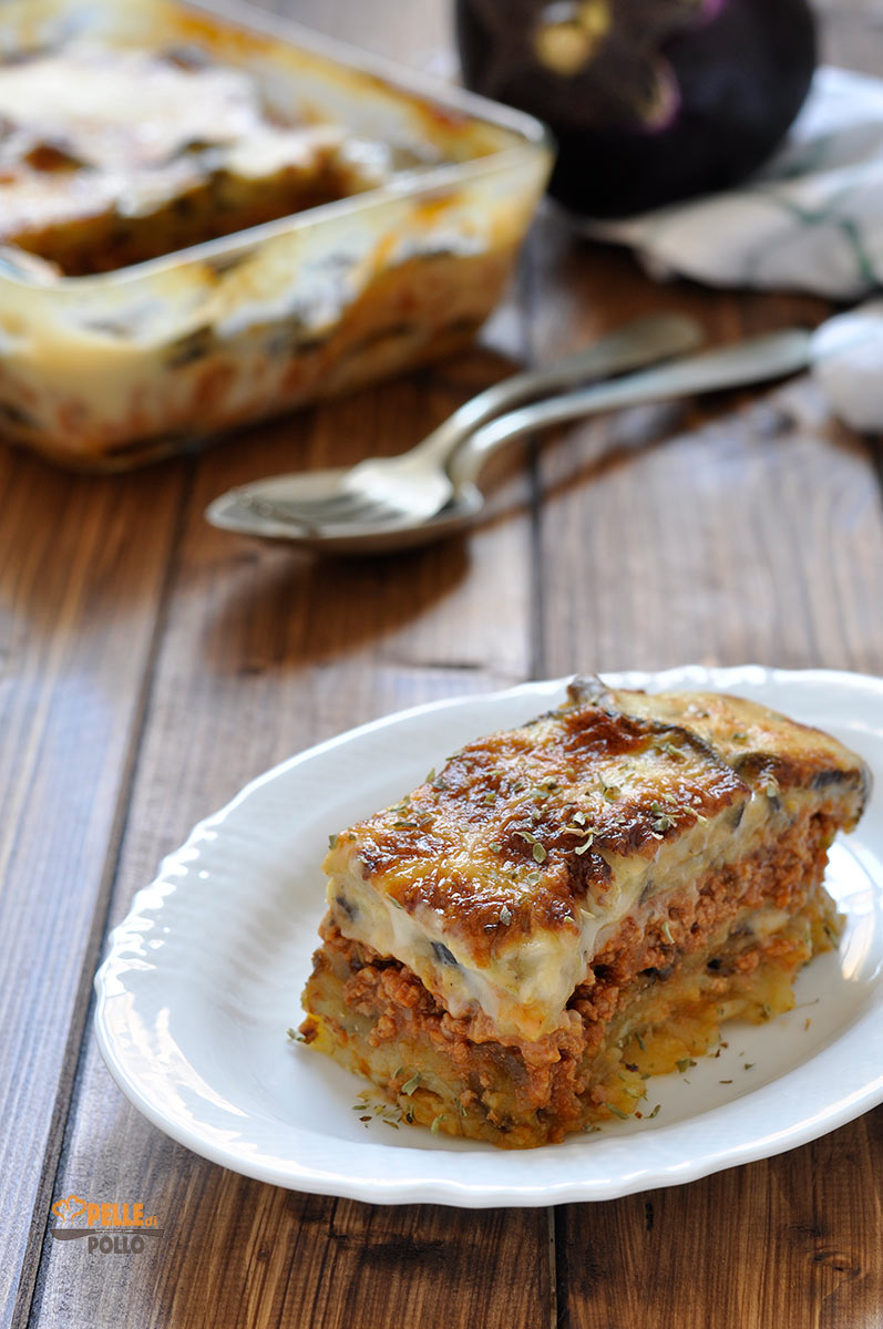 La moussaka è un piatto tipico della cucina greca, a base di melanzane, alternate a strati con patate e ragù di carne… il tutto ricoperto di cremosa besciamella. Occorre un po’ di tempo per prepararla, ma il procedimento è semplice, e il risultato è davvero gustosissimo! Per rendere la ricetta un po’ più leggera, ho cotto le melanzane al forno, con poco olio… se preferite, potete friggerle, come nella ricetta originale, oppure grigliarle. Provate anche voi la moussaka, e fatemi sapere se vi è piaciuta!