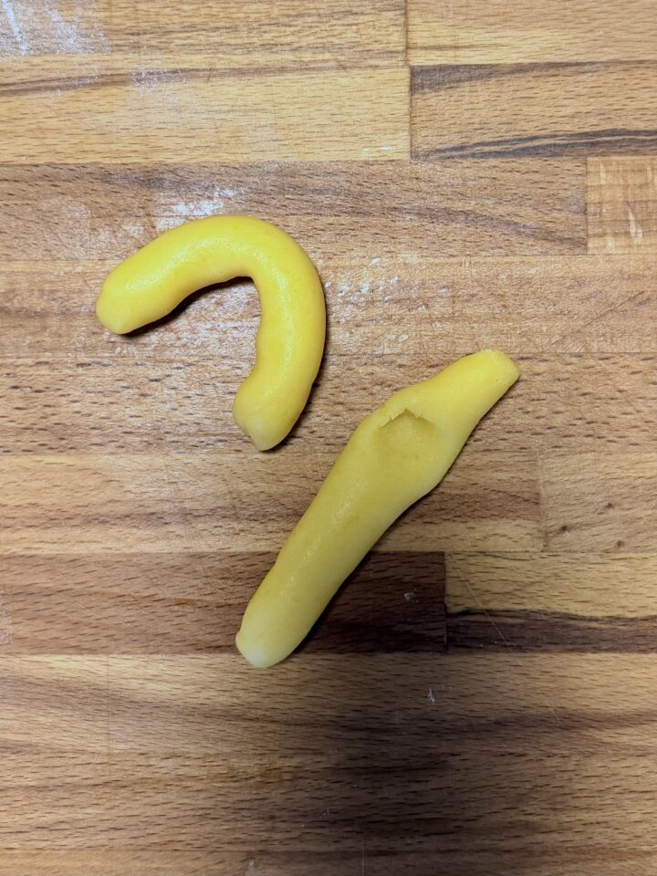 Dividete ogni pezzetto formando 2 piccoli cilindretti. Con un dito, create un incavo in uno dei cordoncini, poi sistemateci sopra il secondo, piegato ad U (1).
