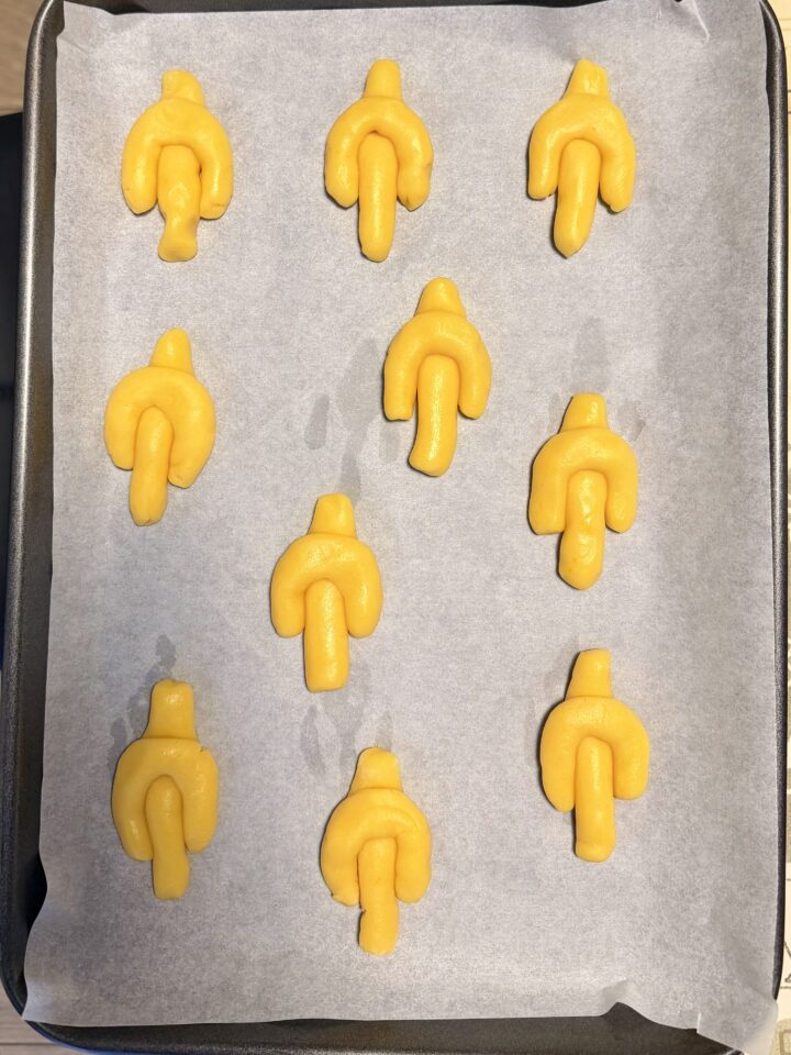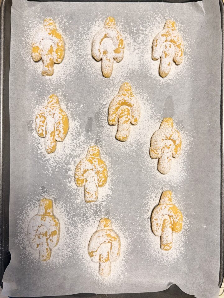 Proseguite in questo modo fino ad esaurire l’impasto, e disponete le colombine su 1 o 2 teglie, rivestite di carta forno (2).
