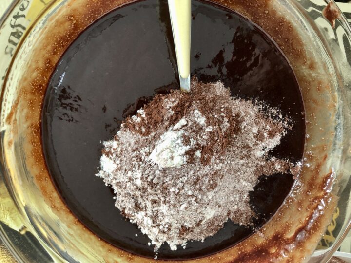 Ora aggiungete la farina e il cacao setacciati. Fate amalgamare, sempre con un cucchiaio, cercando di mescolare il meno a lungo possibile (2).