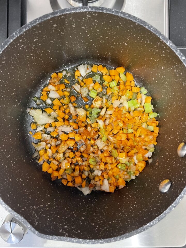 Pulite sedano, carota e cipolla, tritateli finemente e metteteli in un tegame. Unite un giro di olio extravergine, un cucchiaino di semi di cumino e mezzo cucchiaino (o più) di paprika (1).
