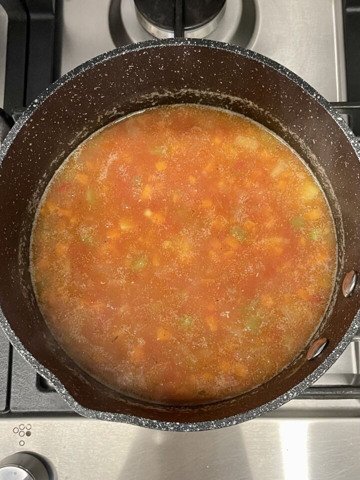 Mescolate, coprite tutto con abbondante brodo vegetale (bollente) e unite la polpa di pomodoro (2).