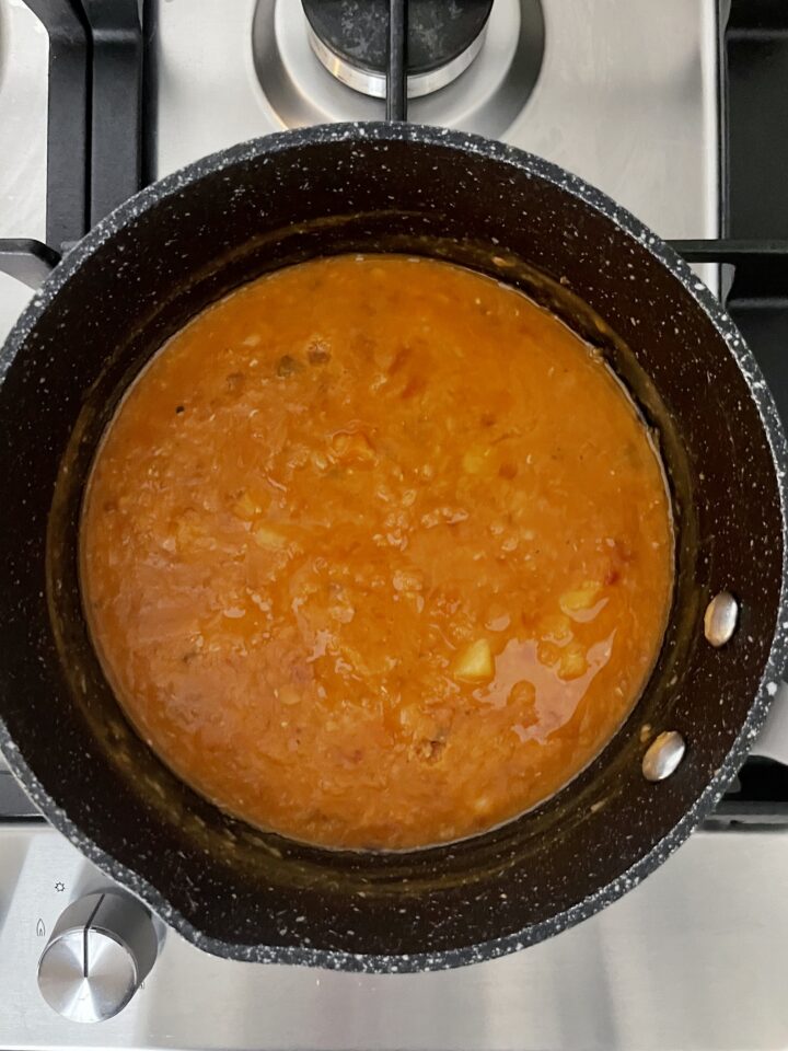 Al termine, se la zuppa dovesse risultare un po’ liquida, potete frullarne una parte con il mixer ad immersione. Io non l’ho fatto perché la mia risultava già abbastanza cremosa, le lenticchie rosse decorticate tendono infatti a sfaldarsi facilmente.