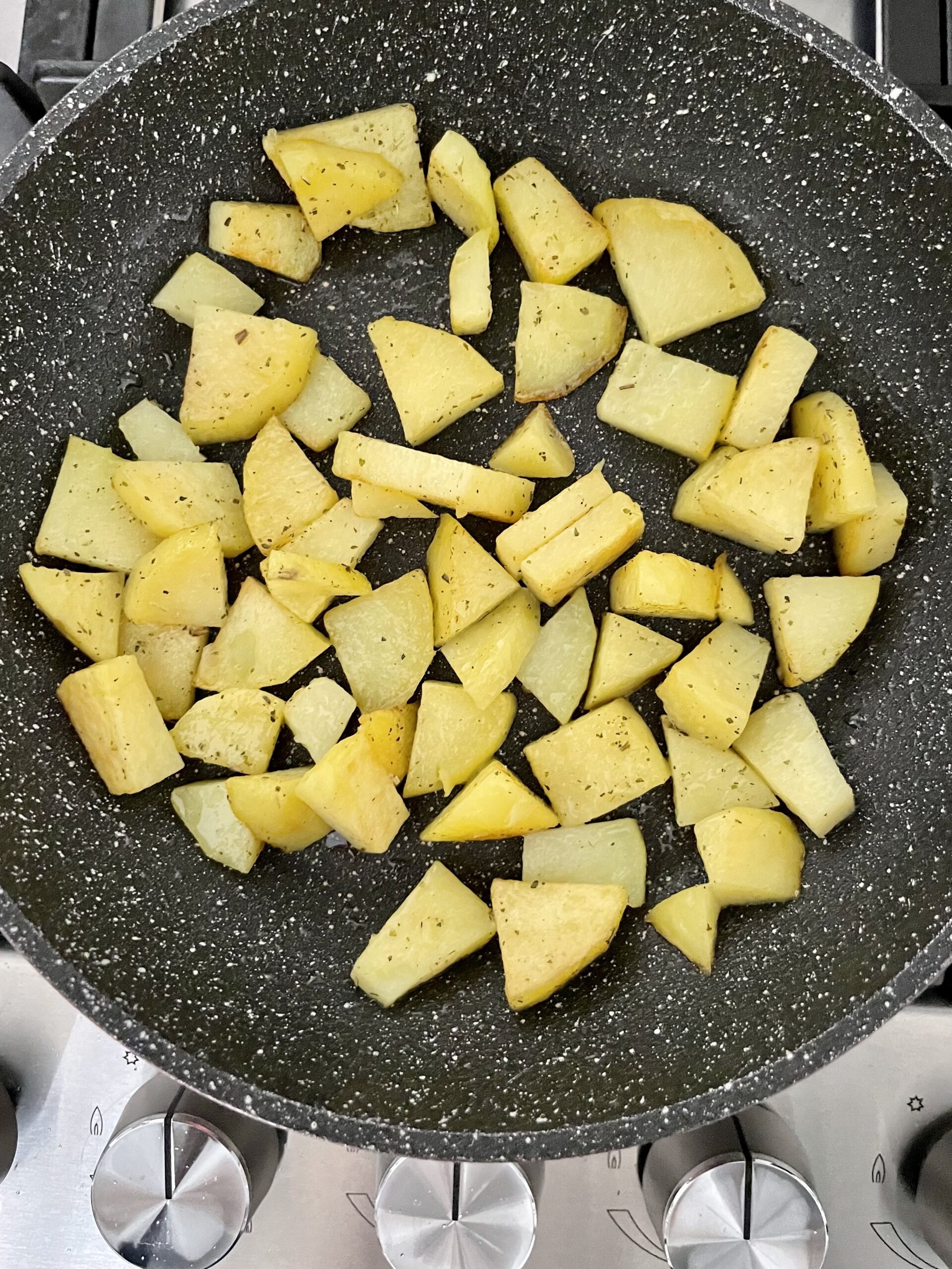 Lavate e sbucciate le patate, tagliatele a tocchetti. Fatele cuocere in una padella con un giro di olio extravergine e un pizzico di sale, finché saranno tenere ma rosolate all’esterno (1).