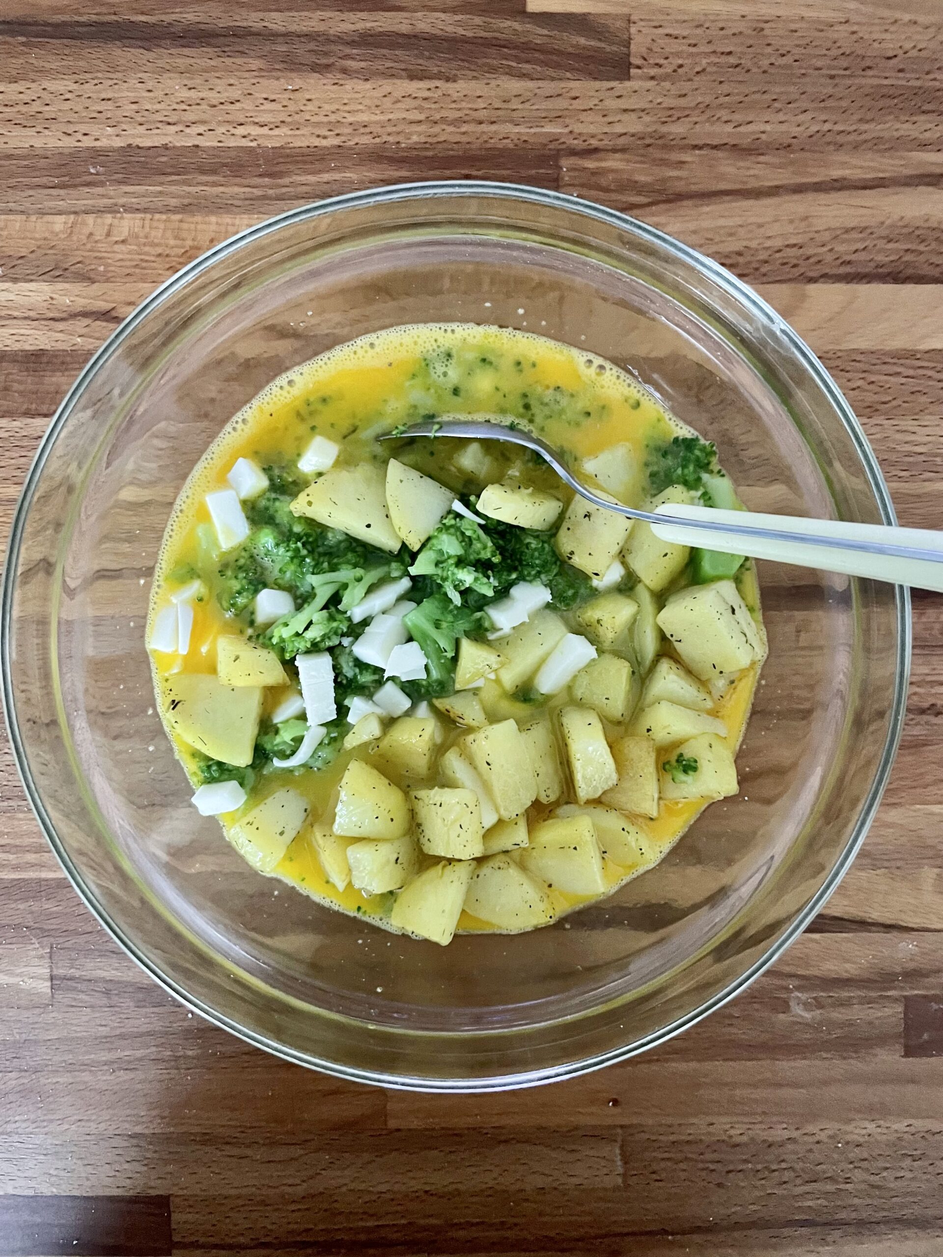 Aggiungete i broccoli, le patate e la provola, tagliata a piccoli cubetti (2). Mescolate in modo da far distribuire gli ingredienti.