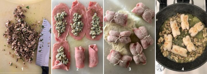 Disponete su un tagliere le fettine di lonza e battetele leggermente. Salatele (io ho utilizzato un sale alle erbe) e aggiungete un po’ di ripieno ai funghi (2).