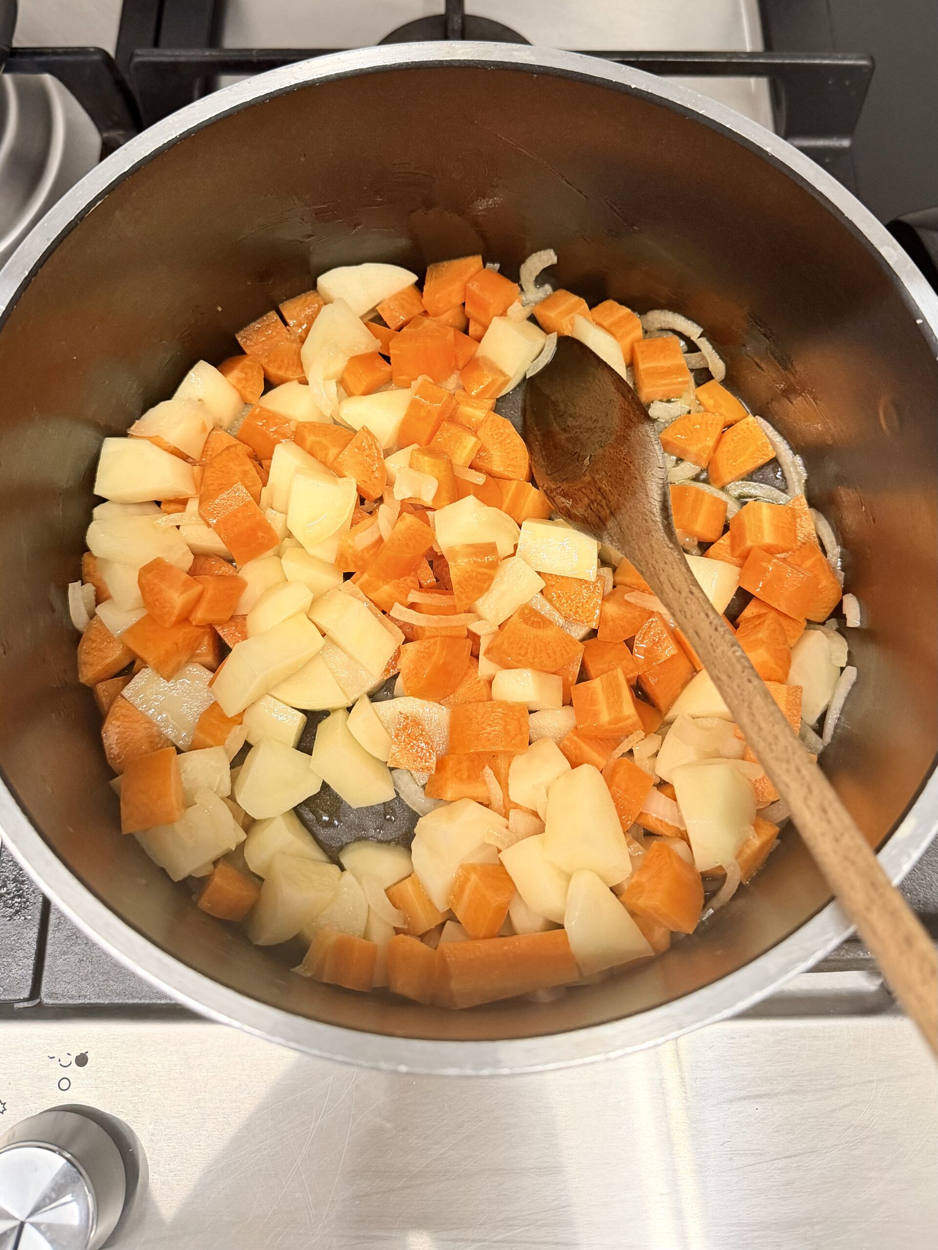 Fate soffriggere per pochi secondi, poi unite le carote e le patate (1). Salate e coprite con il brodo vegetale bollente. A piacere, aggiungete un cucchiaio di concentrato di pomodoro.
