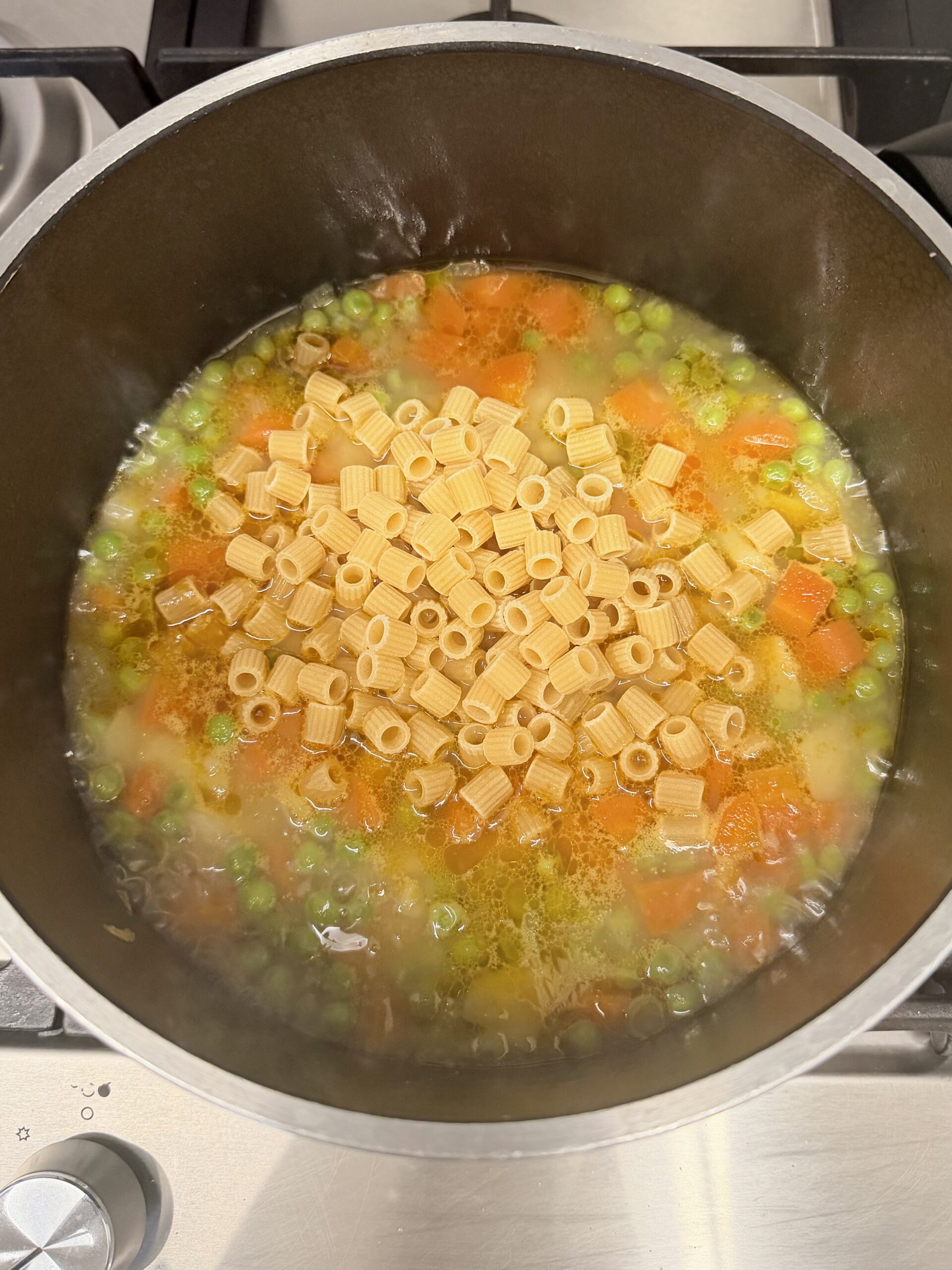 Infine, buttate la pasta e cuocetela per i minuti necessari, aggiustando la densità con il brodo vegetale (3).