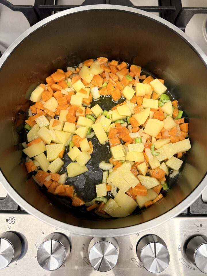 Versate un filo di olio in un tegame, aggiungete sedano, carota e cipolla, e fate soffriggere per pochi istanti.