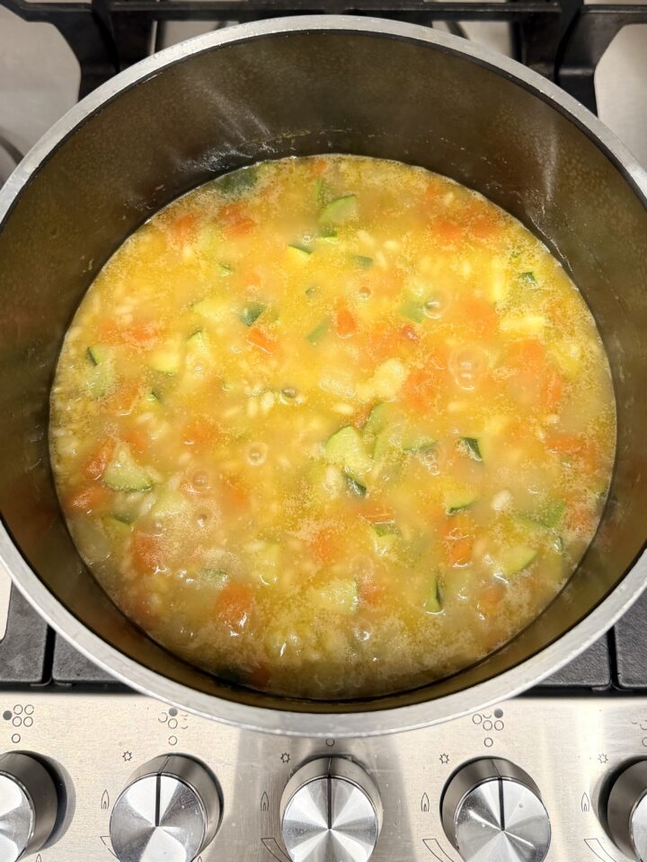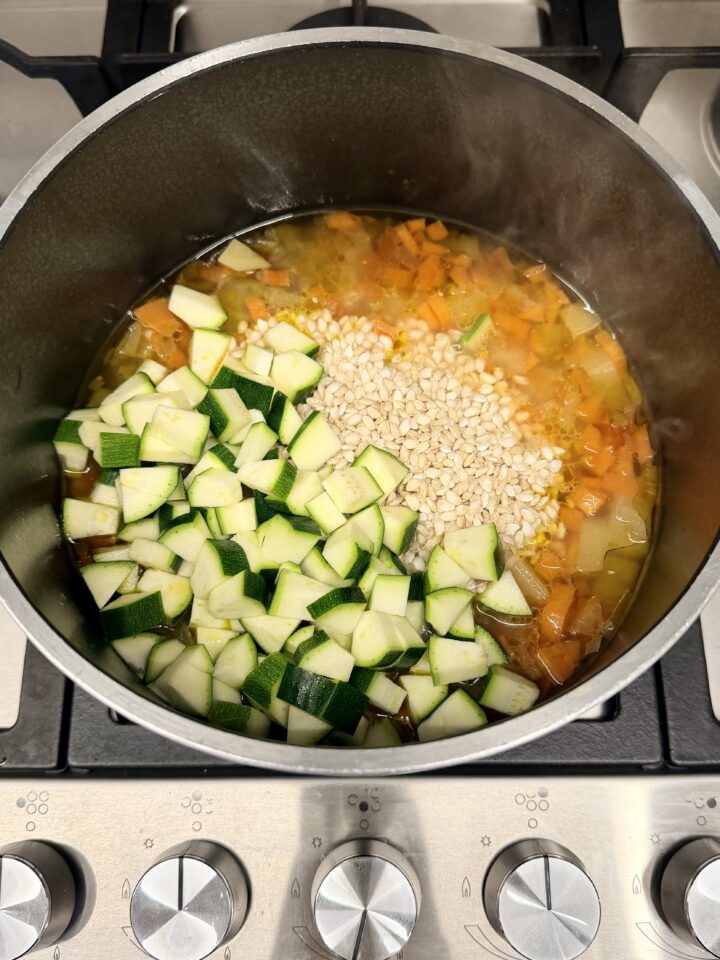 Aggiungete poi il riso, le zucchine (2) e bagnate con un altro po’ di brodo.