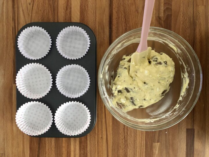 Prendete il vostro stampo da muffin e i pirottini di carta (1). Io ho utilizzato due stampi da 6 muffin, ma va benissimo uno stampo grande da 12.