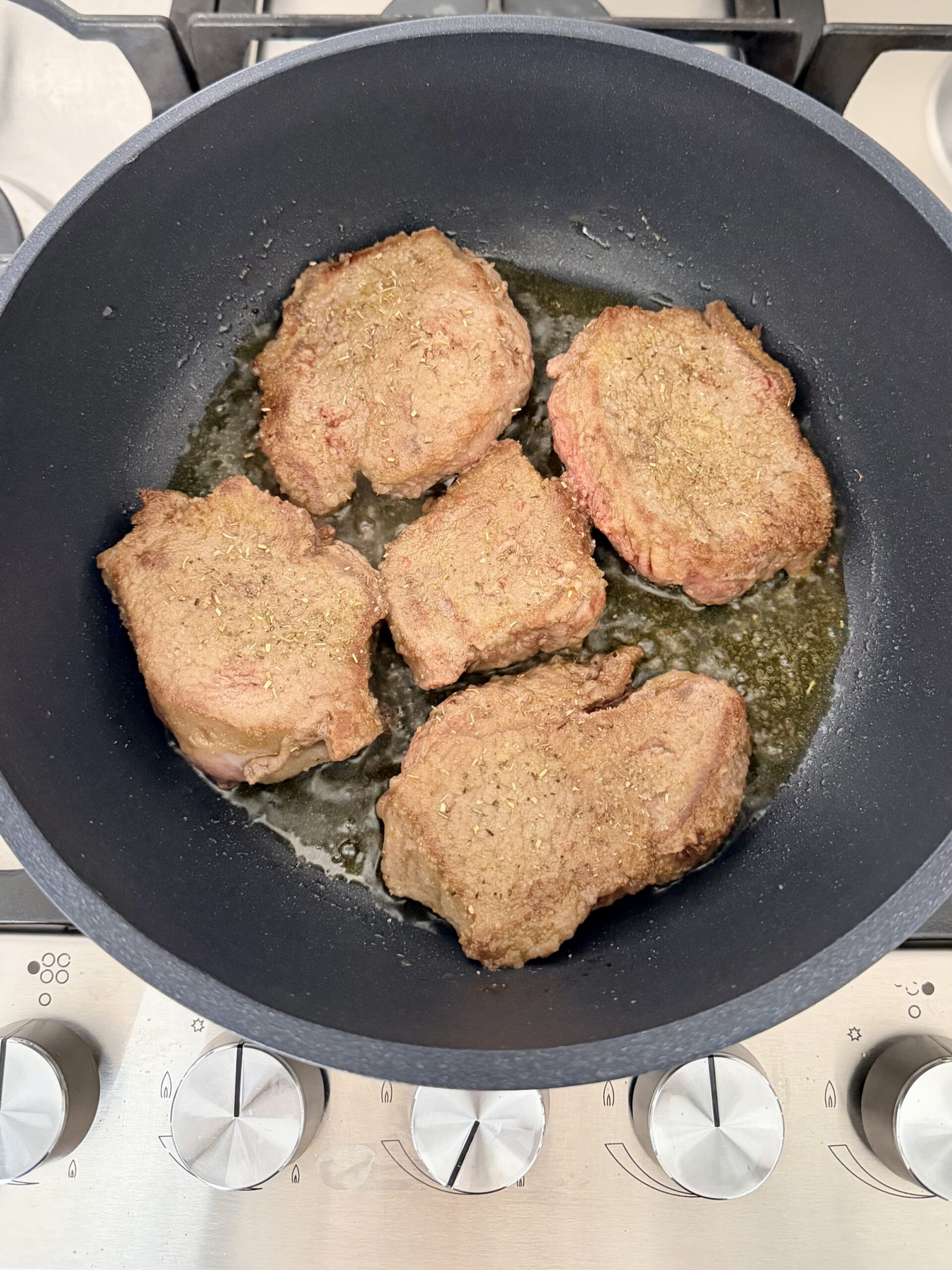 Scaldate un tegame con un filo di olio e rosolatevi le fette di carne da entrambi i lati (1). Salate e sfumate con il vino bianco.