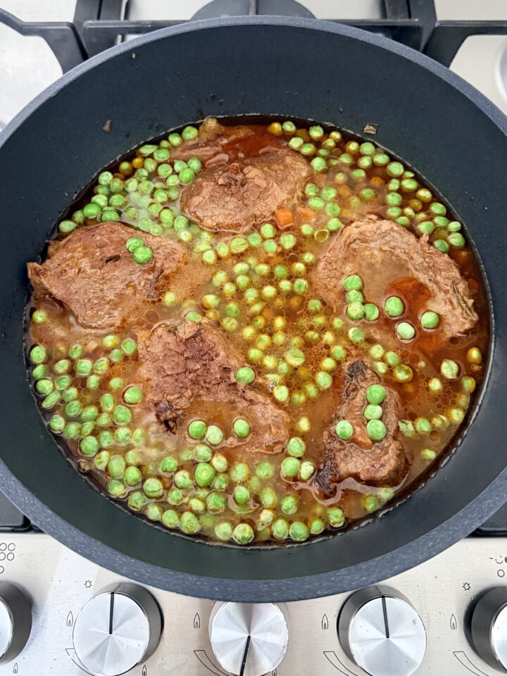Proseguite la cottura per altri 15 minuti circa, o comunque finché i piselli saranno teneri e la carne sarà molto morbida. Scoprite il tegame se volete restringere un po’ il sughetto.