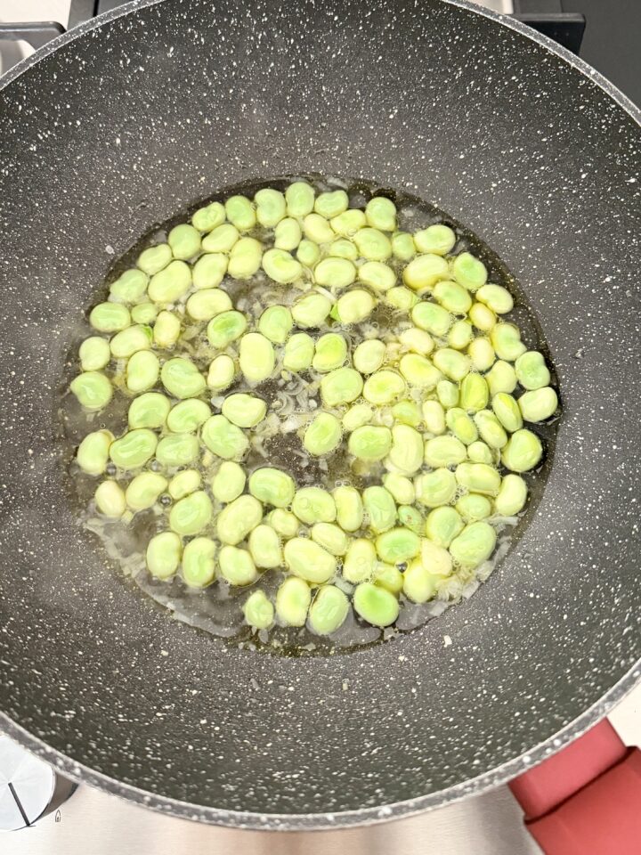 Se le vostre fave sono fresche e di piccole dimensioni, non occorre togliere la pellicina che le ricopre, altrimenti eliminatela tenendo solo il seme all’interno.