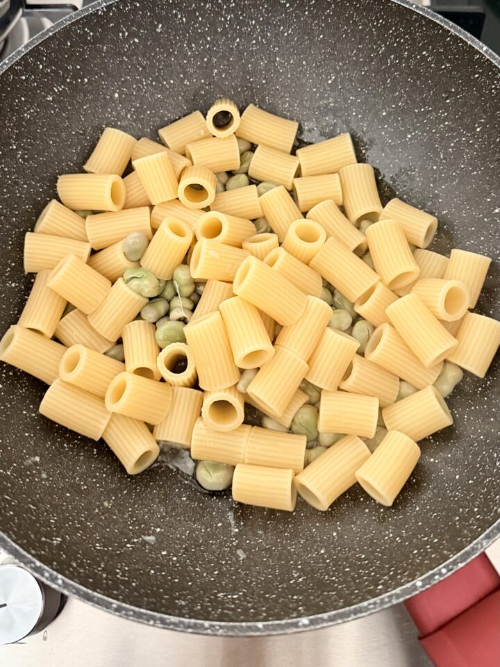 Scolate la pasta leggermente al dente e versatela nella padella con le fave (3). Aggiungete la crema di ricotta e mescolate per un paio di minuti a fiamma vivace. Se necessario, bagnate con altra acqua.