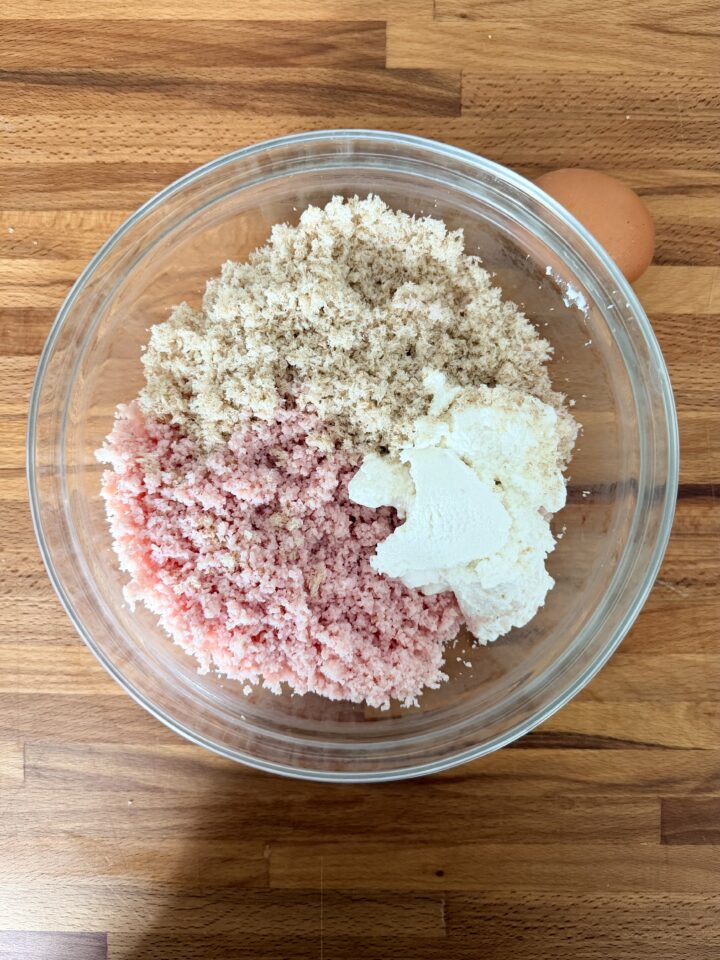 Con l’aiuto di un mixer, tritate finemente il prosciutto cotto e il pane in cassetta. Metteteli in una ciotola, aggiungete la ricotta, l’uovo, un pizzico di origano, aglio in polvere a piacere e sale (1).