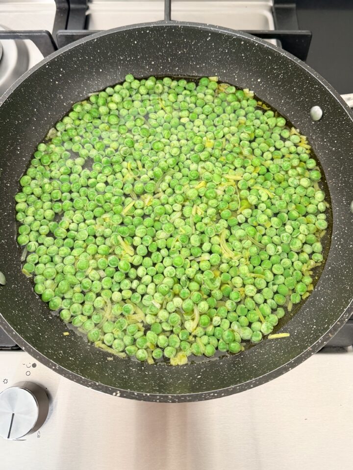 Nel frattempo, tritate il cipollotto e fatelo appassire in padella con un filo di olio. Unite i piselli, salate e bagnate con poca acqua calda (3).