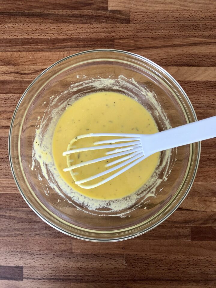 Nel frattempo, sbattete le uova in una ciotola, con sale, pepe ed erbe aromatiche a piacere.