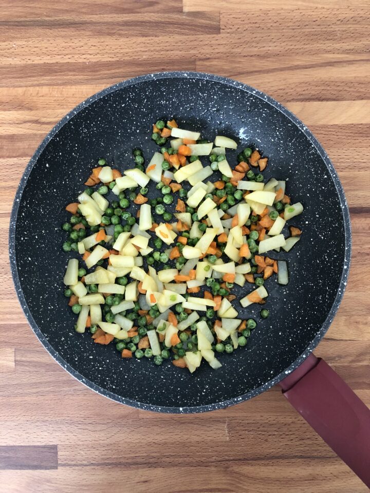 Mettete le verdure e i piselli in una padella ampia, aggiungete un filo di olio, un pizzico di sale e fatele cuocere per pochi minuti, finché le patate saranno tenere. Se necessario, potete bagnare il fondo con un goccio di acqua.