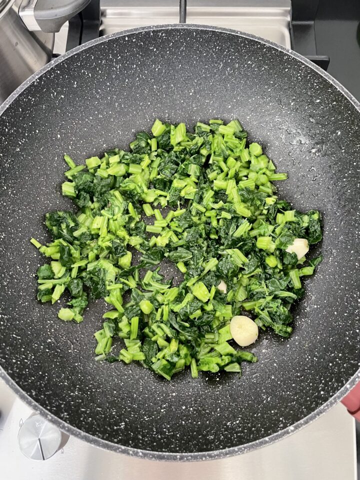 Ripassatele in padella per pochi minuti, con un filo di olio, uno spicchio d’aglio e un pizzico di peperoncino a piacere (1). Regolate di sale, poi spegnete e lasciate raffreddare.