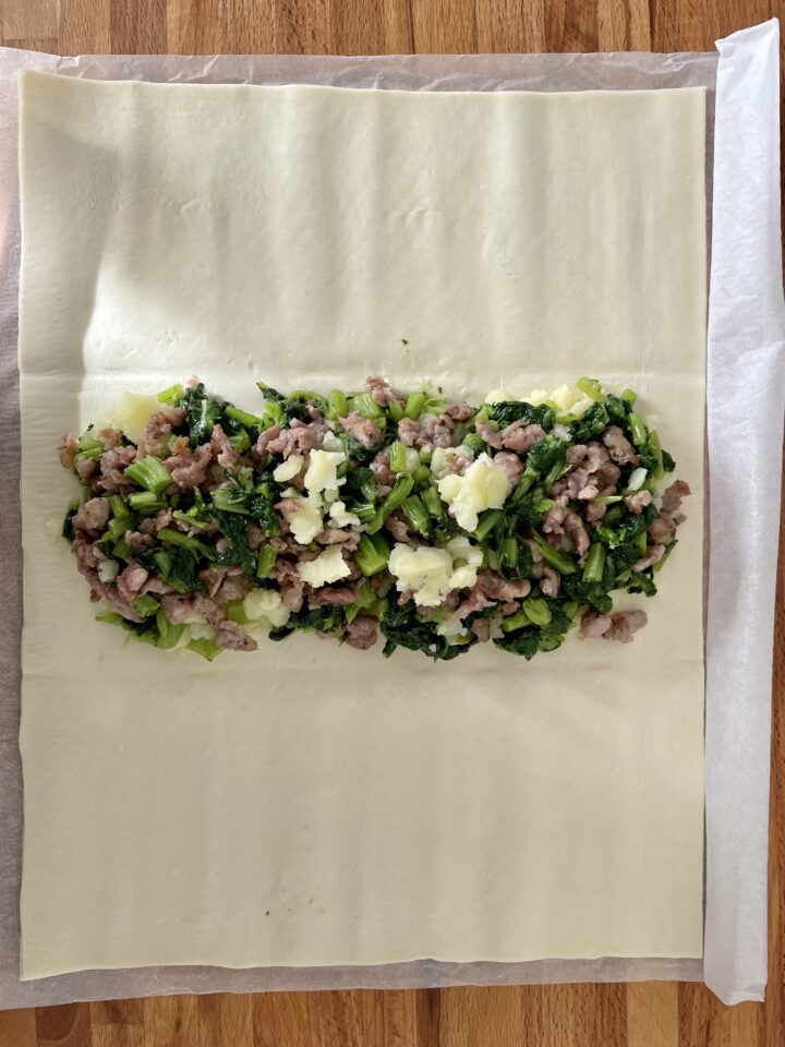 Aprite la pasta sfoglia e suddividetela in 3 parti, senza tagliarla. Disponete nella parte centrale la patata lessa, le cime di rapa e la salsiccia (2).