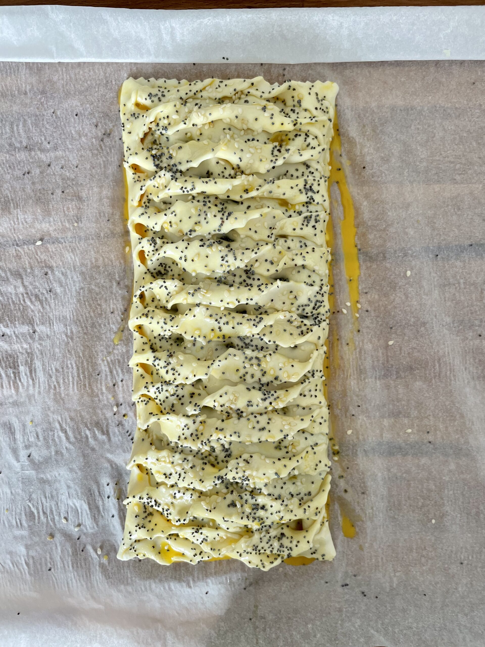 Sistemate lo strudel su una teglia, spennellate la superficie con l’uovo sbattuto e cospargete a piacere con i semi (3).