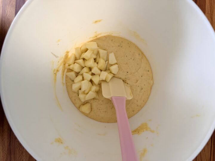 Unite poi la farina, il lievito e le noci tritate. Fate incorporare senza creare grumi, infine aggiungete le mele (1) e distribuitele.