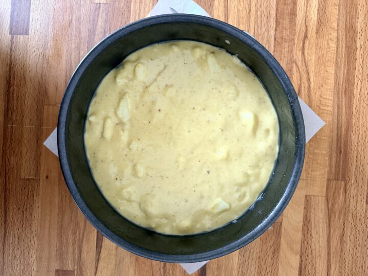 Rivestite la tortiera con carta forno (oppure ungetela e infarinatela), versateci l’impasto e livellate (2).