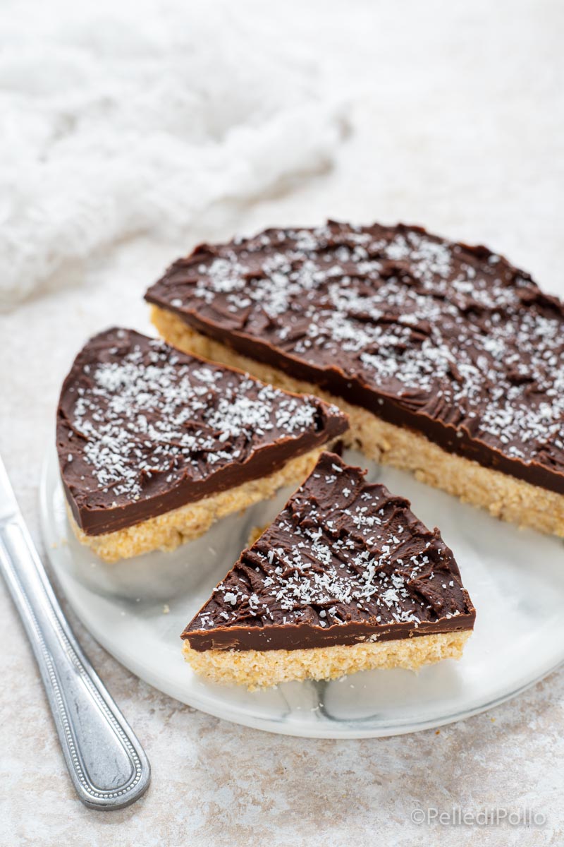Un dolce senza cottura veloce e semplicissimo, una specie di “biscotto” con una base tipo cheesecake e una golosa copertura al cioccolato. La preparazione è molto facile, dopo aver realizzato la base con biscotti tritati, burro fuso e farina di cocco, la si ricopre con il cioccolato fuso e si mette a rassodare in frigorifero. La torta fredda al cocco e cioccolato si può preparare in anticipo e si conserva al fresco per alcuni giorni… ecco a voi ingredienti e procedimento, e non dimenticate di leggere le note in fondo dove troverete altri utili consigli!